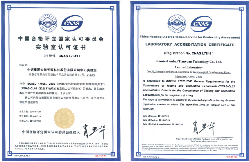 針對(duì)現(xiàn)場(chǎng)評(píng)審提出的問題和不符合項(xiàng),公司中心實(shí)驗(yàn)室經(jīng)過近3個(gè)月的整改,于2015年6月初將整改報(bào)告遞交至CNAS,CNAS確認(rèn)了申請(qǐng)認(rèn)可的多個(gè)檢測(cè)項(xiàng)目的檢測(cè)能力,并于2015年8月4日向中鋼天源中心實(shí)驗(yàn)室頒發(fā)了CNAS認(rèn)可證書。